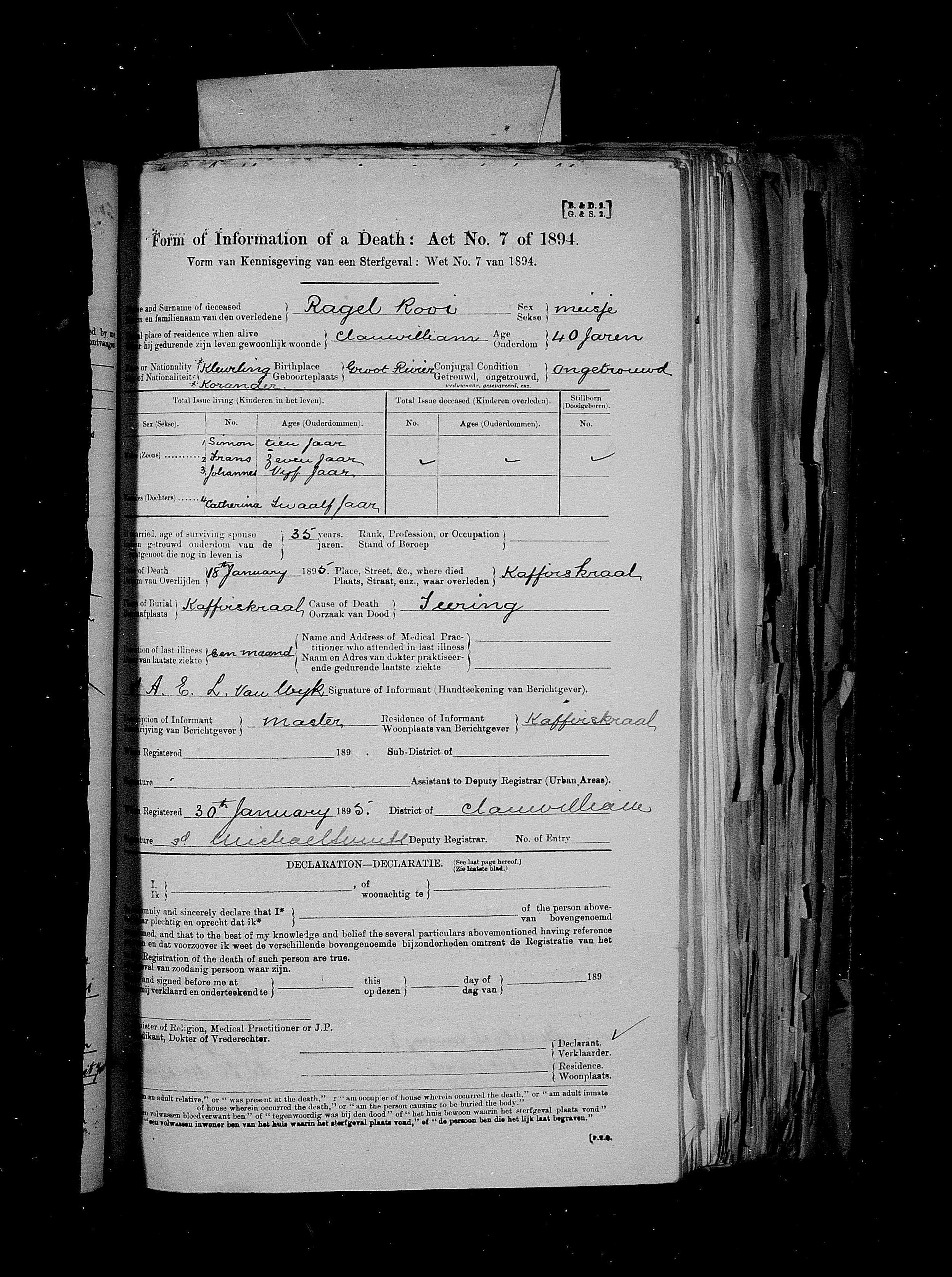 The records of Civil Deaths for Clanwilliam are presently being transcribed from 1895 onwards. These records provide full names of deceased, age, gender, race, residence, place of death, date of death, intended place of burial as well as cause of death. Should you wish to see the actual image you need to go to the year you want to look at and put in the page number corresponding to the image number as see in the record link below. Please note that every record is transcribed exactly as is. If any surnames, farm names or causes of death are wrong please feel free to contact me with corrections.